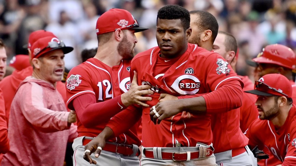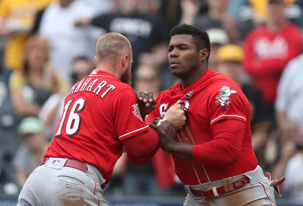 辛辛那提红人队的外野手“野马”亚希埃尔-普伊格无疑是场上的重点被关照人物,此前在道奇队时,这匹野马已是劣迹斑斑,多次引发大乱斗登上体育新闻头版。脾气火爆的普伊格也并没有领人“失望”,在双方开始推搡的时候就冲进了人群直指阿彻。但在红人老大哥乔伊-沃托和海盗队卡布雷拉的阻止下,普伊格暂时稳定了下来不过嘴上还是嘟嘟囔囔想找阿彻理论。