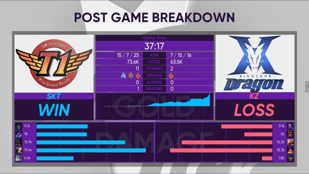 最终局中,KZ战队各路都开送,SKT在前期就拿下了巨大优势,中期KZ试图偷龙,结果被李哥阿卡丽赶到秒杀打野,SKT众人赶到之后不仅打赢了团战还拿下了大龙,最终下路找到机会一波团战结束了比赛。