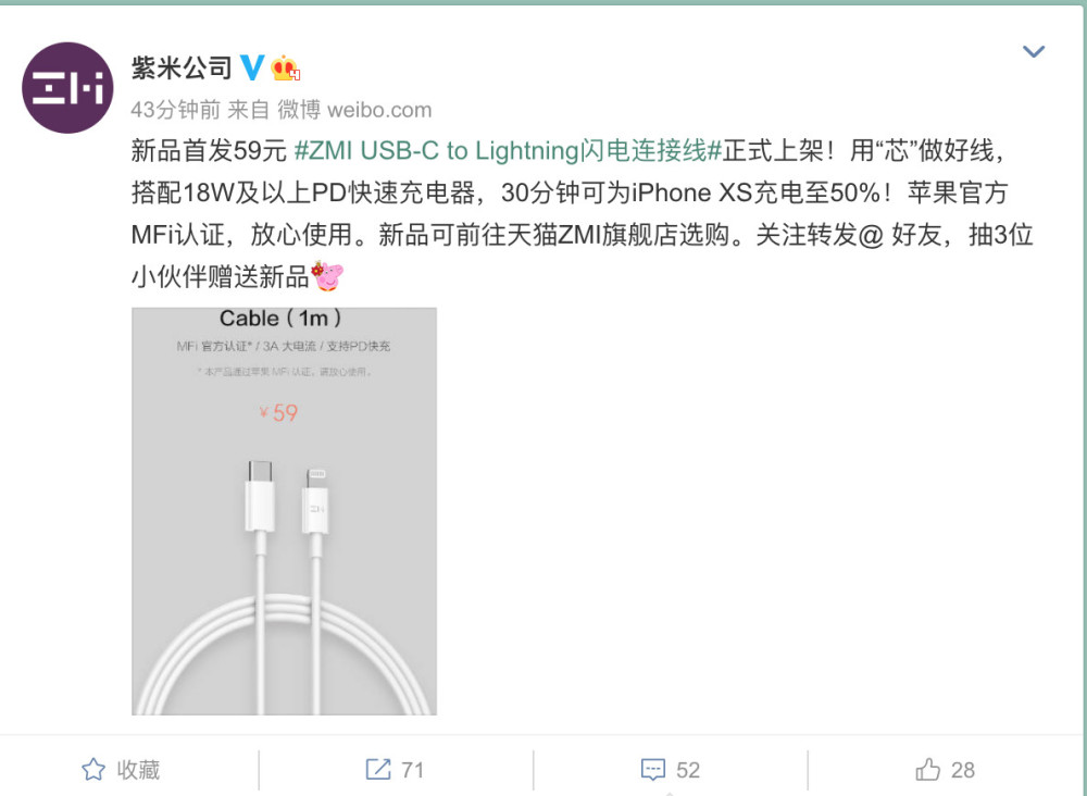 今天上午,小米生态链企业紫米在微博上公布消息称,USB-C转Lightning快充线已经在天猫旗舰店上架。具体零售价为79元,新品促销价为59元。