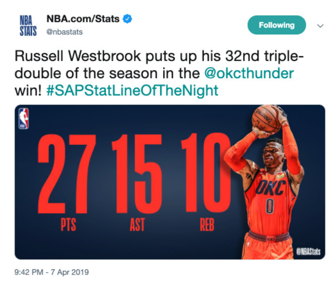 今天的比赛,韦斯布鲁克再次拿下了三双表现,对阵森林狼,韦斯布鲁克全场出战38分钟,22投10中,得到了27分10篮板15助攻的三双数据,帮助球队拿下了胜利,比赛结束之后,NBA官方也将韦斯布鲁克的表现,评选为今日NBA的最佳数据。
