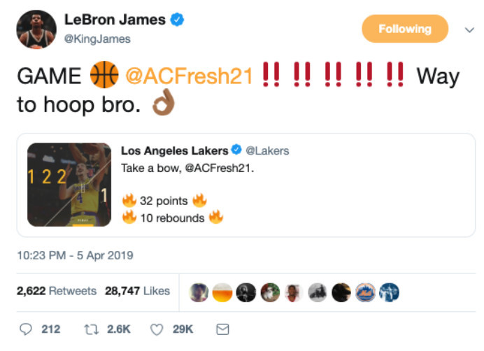 同样的问题摆在詹姆斯的面前,离开骑士加盟湖人,真的是一个正确的选择?这个赛季,湖人已经提前无缘季后赛,詹姆斯早早结束了本赛季,不过,这倒是也给了湖人的边缘球员们更多机会。上场战胜快船的比赛中,卡鲁索全场砍下了32分10篮板5助攻,看到卡鲁索这样的表现,在社交媒体上,詹姆斯也发文称赞其表现。值得一提的是,今天对阵爵士的比赛,卡鲁索再次砍下了18分11助攻。