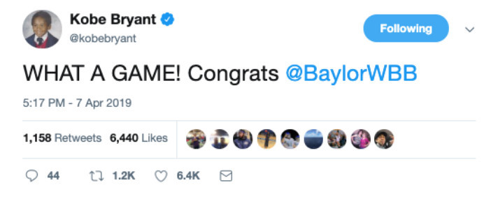 自从退役之后,科比似乎总是很关注女篮的比赛。今天的NCAA女篮决赛,贝勒大学82-81惊险战胜了圣母大学,拿到了最终的冠军。在社交媒体上,科比第一时间发文表示祝贺,“多么精彩的一场比赛,恭喜贝勒大学。”