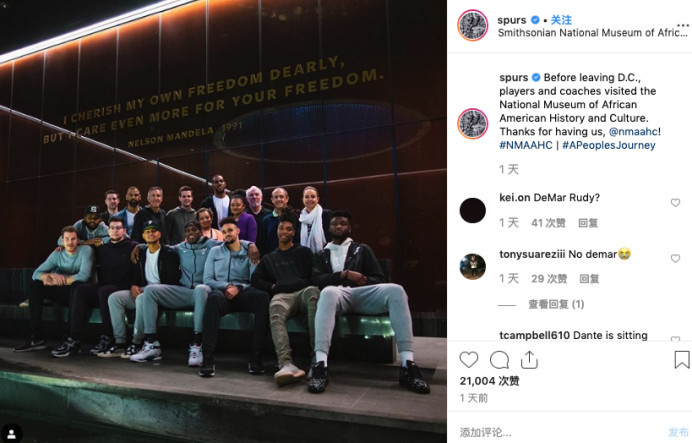 马刺最近状态不错,过去的4场比赛,他们拿下了其中的3场。虽然行程紧密,但最近马刺成员们,还是前往参观了国立非洲裔美国人历史和文化博物馆。