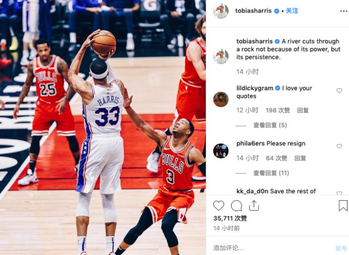 托比亚斯-哈里斯整个赛季都是那个心灵鸡汤先生,在社交媒体上,哈里斯晒出了一张自己在比赛中的照片,然后写道,“流水能够击穿石头,并非因为力量,而是因为坚持。”