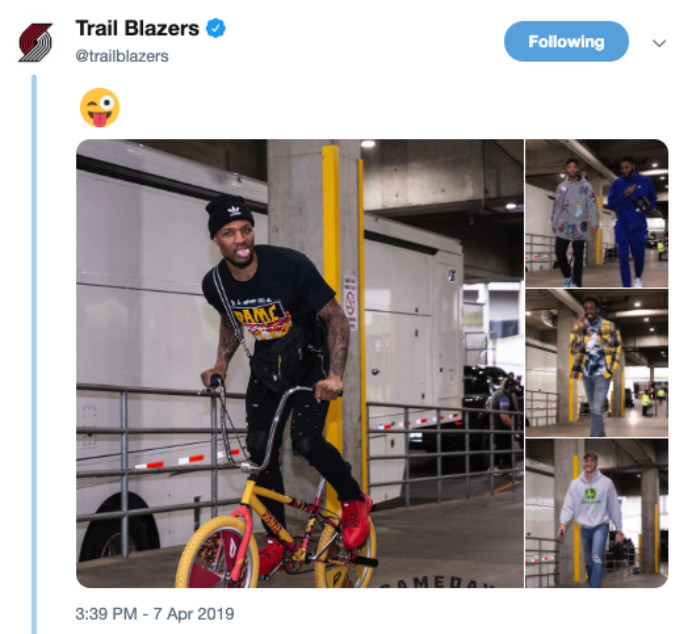 而开拓者球星利拉德,今天骑着一辆自行车,进入了球馆。