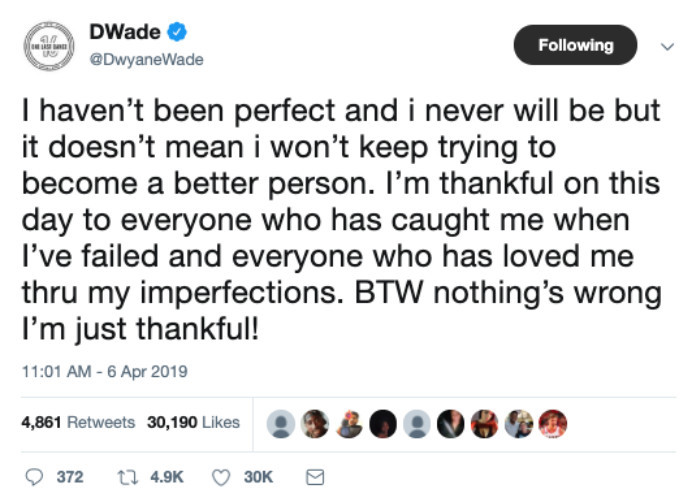 赛季即将结束,韦德的比赛也变得越来越少。最近一段时间,保罗-皮尔斯曾经在节目中公开质疑韦德,不过,韦德并没有正面和皮尔斯应怼。今天在社交媒体上,韦德写道,“我不是一个完美的人,以前不是,以后也不会是。但这并不意味着,我不会继续努力争取成为一个更好的人。感谢那些在我失败的时候,仍然支持我的人。还有那些知道我不完美,依然爱着我的人,没有什么问题,我就是想要感激。”