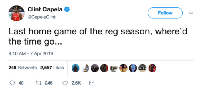 时间过得真是太快了,不知不觉,一个赛季又要结束了。在社交媒体上,火箭中锋卡佩拉也在感慨,时光易逝。今天对阵太阳,是火箭本赛季最后一次在主场打常规赛,在社交媒体上,卡佩拉就写道,“主场的最后一场常规赛,时间都去哪了?”