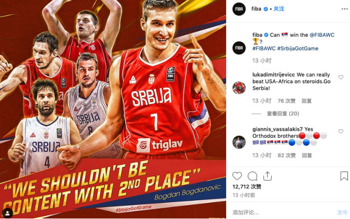 当然,除了NBA的比赛,今夏的男篮世界杯,也值得关注。作为2014年世界杯的亚军和2016年的奥运会男子篮球的亚军,塞尔维亚队能否更进一步值得关注。近日谈及这个问题,塞尔维亚球星博格达诺维奇就表示,“我们不应该满足于第二的位置。”国际篮联官方在社交媒体上,晒出了这样一张大海报,然后写道,“塞尔维亚能够拿下世界杯的冠军么?”