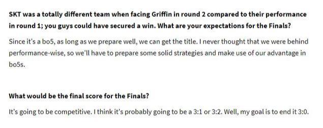 在采访中Faker谈到了他们在决赛中将要面对的GRF,Faker表示他们BO5更加具有经验,虽然觉得决赛会很激烈,但还是认为SKT能够赢下比赛,表示SKT最后会以3-1或3-2的比分赢下比赛,对于目前的SKT十分自信。