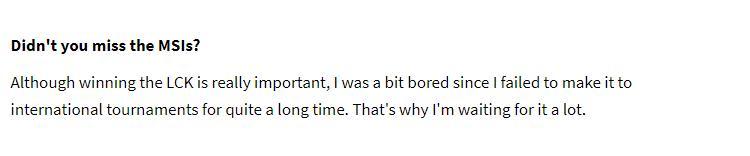 拿下季后赛的冠军意味着拿到MSI的门票,而在提起这个问题时Faker也是显得有些迫不及待,表示很久没有参加国际赛事感到有些无聊,称等待这个机会已经很久了,看得出Faker对于SKT在S8赛季的表现感到非常憋屈,已经压抑了非常久了,而Faker的目标应该是想要在国际赛事中击败LPL夺回LCK的荣耀吧。
