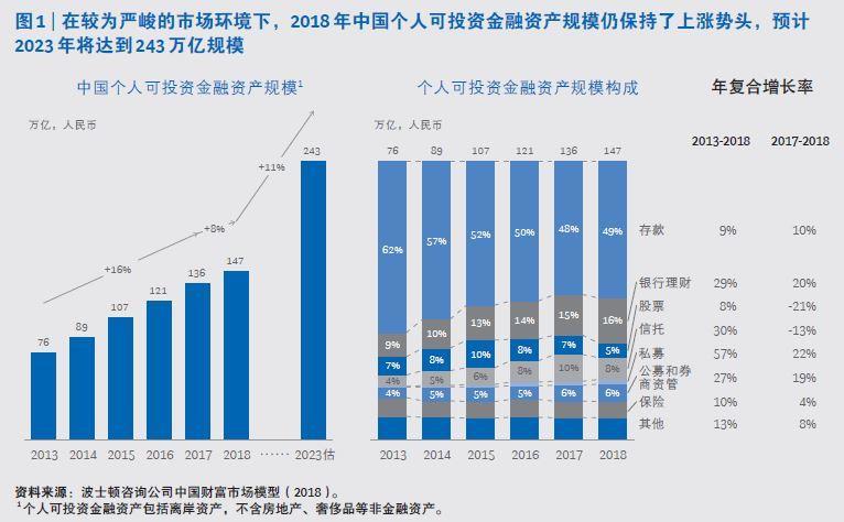 这份题为《中国私人银行2019:守正创新 匠心致远》的报告称,受到2018年外部经济环境、监管环境和资本市场表现的影响,2018年国内个人可投资金融资产增速仅为8%,较过去五年显著放缓,尤其是股票、信托、私募类产品的增速都有较明显下降。