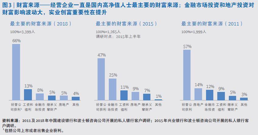 过去十年,受到经济和房地产市场高速成长等因素的驱动,居民财富增速尤其显著。面向未来,随着经济增速放缓,房地产市场走向稳定和金融市场的成熟,存量财富的保值增值更加受到关注。而从整个财富管理市场来看,对于存量财富和客户深耕的重要性也将不断提升。中国高净值人群的主体是一代企业家,经营企业获利一直是高净值客户财富的主要来源。在经历了过去几年国内股市牛熊变幻、房市起落之后,经营实业作为高净值人士主要创富来源的地位反而愈发巩固。面向未来,企业家仍将是中国高净值客户群体的中坚力量,新一代企业家在崛起,老一辈企业家对于资产结构的调整,尤其是金融资产的多元分散配置,都将给财富管理行业带来巨大的机会。