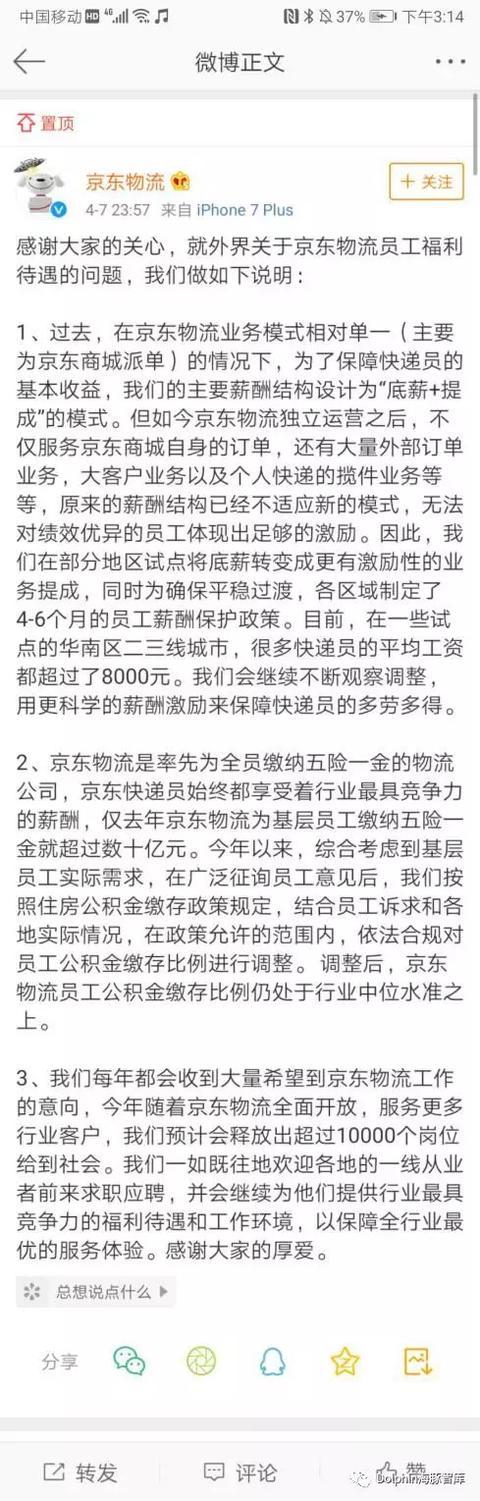 京东物流在4月7日深夜通过微博确认上述消息。他们表示,京东物流在独立运营后新增大量外部订单业务、大客户业务以及个人快递揽件业务等,原来的薪酬结构已经不适应新的模式。因此,通过调整薪资制度以进一步激励员工。