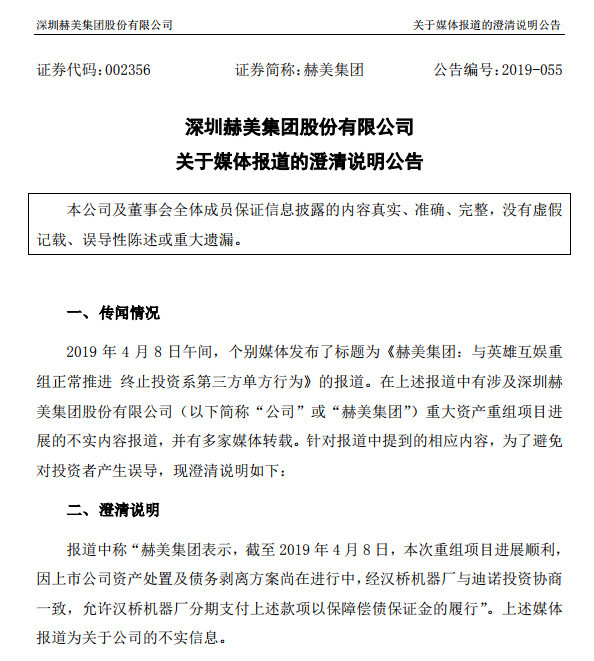 赫美集团表示,4月8日午间,个别媒体发布了标题为《赫美集团:与英雄互娱重组正常推进 终止投资系第三方单方行为》的报道。该报道称,“赫美集团表示,截至2019年4月8日,本次重组项目进展顺利,因上市公司资产处置及债务剥离方案尚在进行中,经汉桥机器厂与迪诺投资协商一致,允许汉桥机器厂分期支付上述款项以保障偿债保证金的履行”。