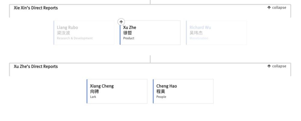 Lark 所在的效率工程部门负责人是公司高级副总裁谢欣,曾是百度核心软件工程师,也曾担任旅游搜索引擎酷讯旅游 CTO,于 2015 年加入字节跳动。在脉脉上 tittle 为高级产品总监的徐哲是 Lark 产品的实际负责人,与他搭配的产品研发部门的负责人是今日头条技术总监梁汝波,包括商业化变现(monetization)负责人吴玮杰在内的三人都向谢欣汇报工作。