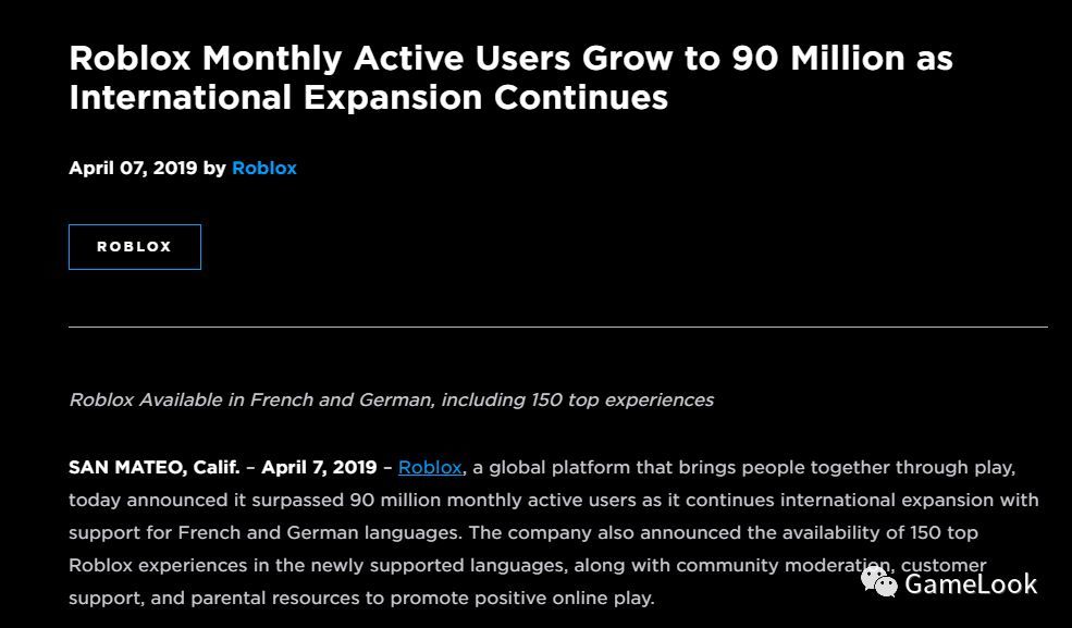 Roblox于当地时间4月7日发布公告表示,这款游戏的全球月活跃用户已突破9000万大关,这项成绩是在加入德语版、以及法语版支持后实现的。目前Roblox已经有150个流行游戏支持最新的语言版。