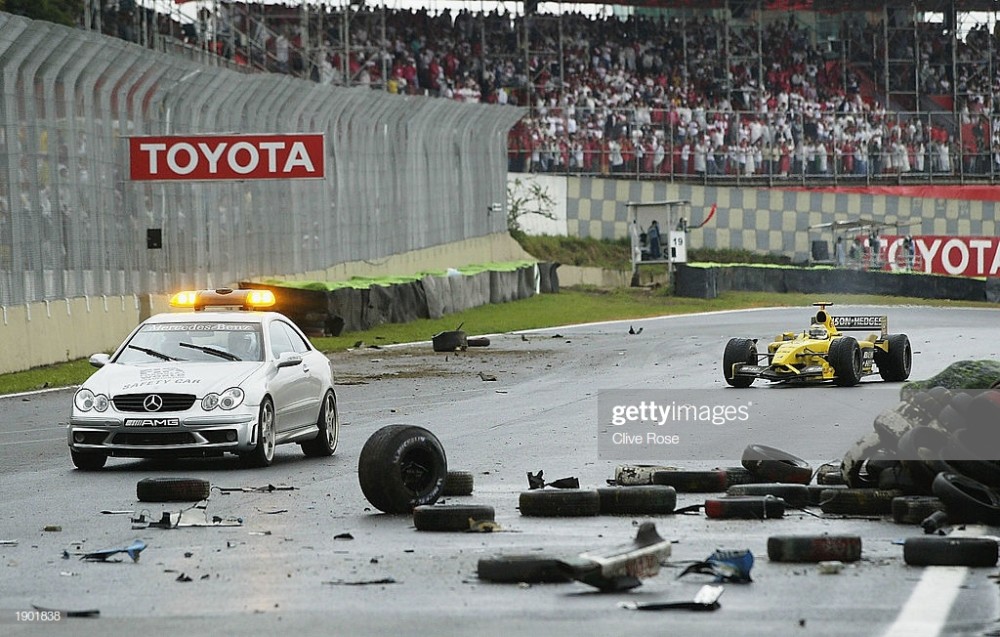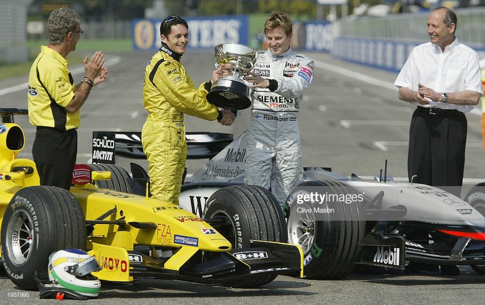 4月6日,英特拉格斯赛道,乔丹车队的意大利车手詹卡洛-费斯切拉夺冠。正赛第54圈,他超越莱科宁来到榜首。一圈后,比赛就因两次严重撞车被迫中止。按照规则,比赛成绩取结束前两圈时的排名;F1官方起初根据第53圈的名次,判定基米·莱科宁夺冠。但几天后,他们认为比赛中止时,费斯切拉已经开始第56圈。因此有了一场特别的颁奖:莱科宁(上图左三)把冠军奖杯交到费斯切拉(上图左二)手中。