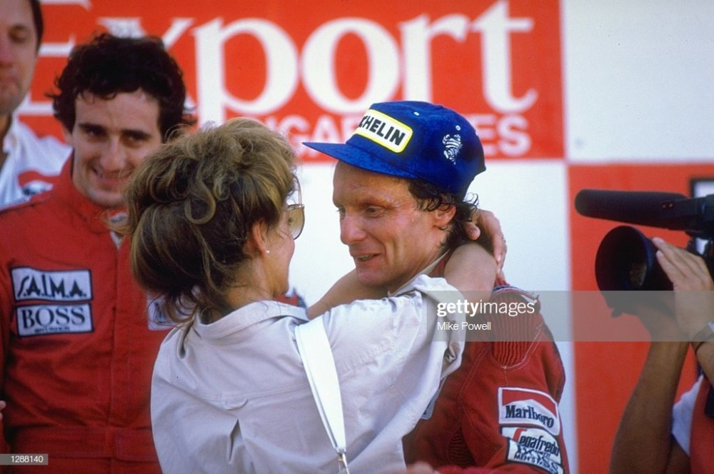 8月19日,奥地利赛道,迈凯轮车队的奥地利车手尼基-劳达夺冠。当时他已是两届车手世界冠军,却不曾在家乡赢过。劳达排位赛仅列第四,但他在正赛赢了杆位得主老尼尔森-皮奎特23.5秒。颁奖仪式上,劳达当时的妻子玛琳(上图白衬衫者)上台和丈夫庆祝胜利。这是劳达复出后的第三个赛季,他以0.5分的优势力压阿兰-普罗斯特,拿到当年车手世界冠军。