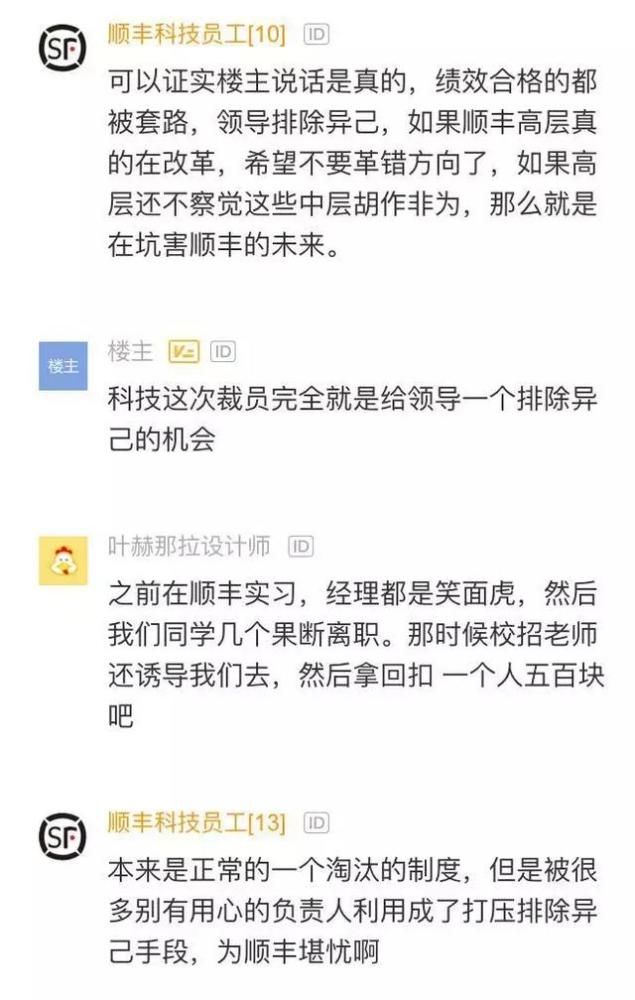 很多顺丰的员工都来坐实楼主的发声,说此次裁员完全就是领导为了排除异己而想出的套路,绩效合格的一锅端!本来就是正常的淘汰制度,却被“有心人”玩成一个手段!