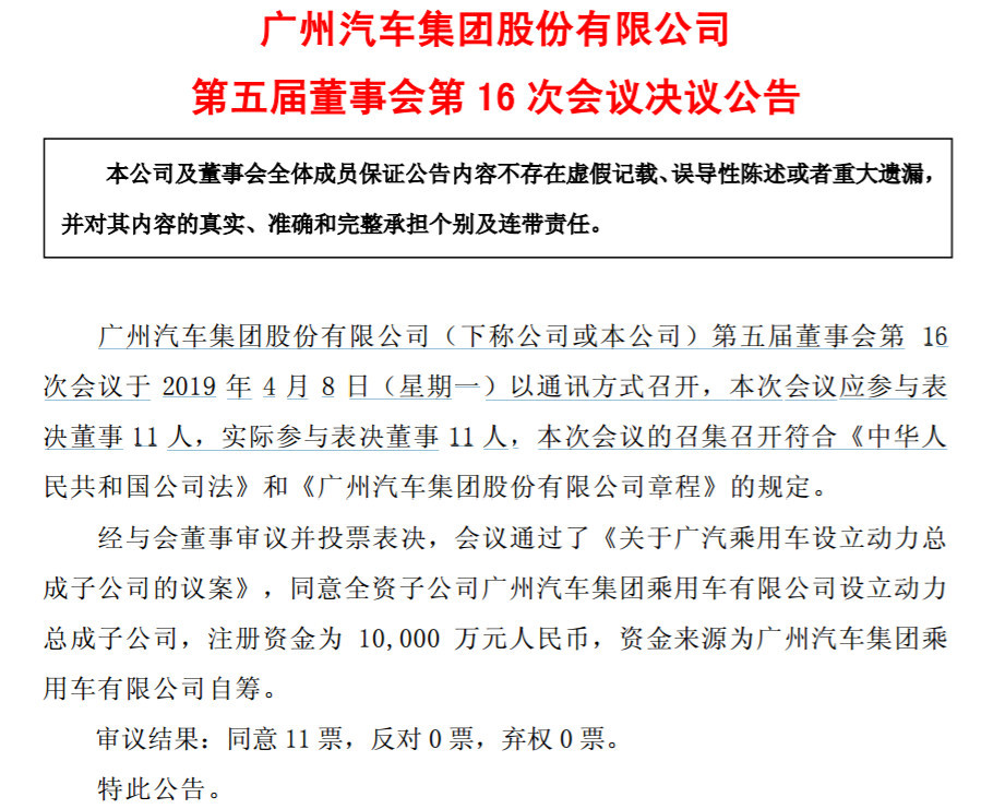 蓝鲸汽车4月9日,昨日,广汽集团(SH601238)发布公告称,该公司第五届董事会第16次会议于2019年4月8日以通讯方式召开,经与会董事审议并投票表决,会议通过了《关于广汽乘用车设立动力总成子公司的议案》,同意全资子公司广州汽车集团乘用车有限公司(以下简称:广汽乘用车)设立动力总成子公司,注册资金为1亿元人民币,资金来源为广汽乘用车自筹。