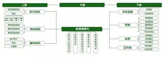 单纯从整车角度来看,通常将电动汽车产业链分为动力电池、电控系统、驱动电机、整车、充电设施、后市场等环节。上游为动力电池、电控系统、驱动电机;中游为整车环节;下游为充电设施、营销以及后市场环节。其中动力电池在成本构成中占比最大,将其作为单独的产业链分析同样不为过,暂且将其所涵盖的矿产资源、零部件归于上游环节。