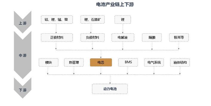 动力电池产业链主要由锂矿资源、锂电池原材料以及电芯制造与封装构成,其中锂电池原材料包括正极材料、负极材料、隔膜、电解液。