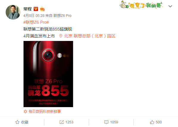 而昨天,联想集团副总裁常程就在早上5点28分正式官宣了联想第二款骁龙855处理器的旗舰手机-联想Z6 Pro。据悉,这款联想Z6 Pro将会搭载满血版高通骁龙855处理器,将在4月份上市发布。