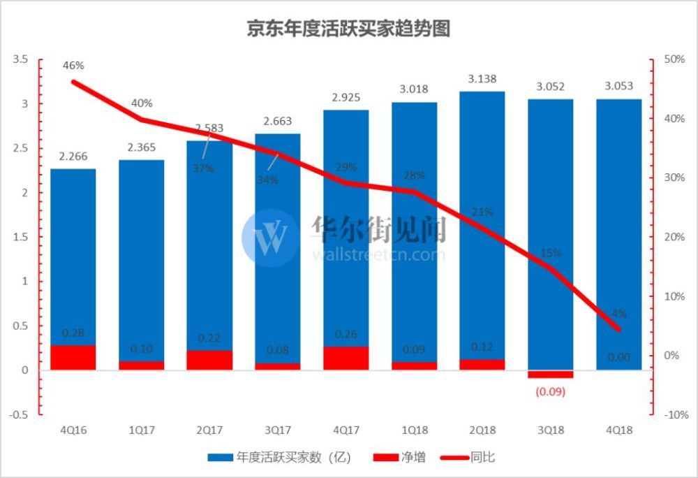 见智在点评京东2018年四季度财报时指出,季度营收增速为22%,增速进一步放缓。季度年度活跃买家数3.053亿(期间产生过至少一次购买行为的用户账户数),环比几乎零增长,成为国内主要电商平台中第一个停滞不前的平台,较天猫淘宝同季度环比3500万的净增用户数相差甚远,用户数的停滞不前成为未来京东增长的一大隐忧。