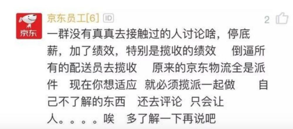 然而刘强东食言了。随着“京东取消快递员底薪”的动作传开,京东快递员的好日子似乎也已到头。