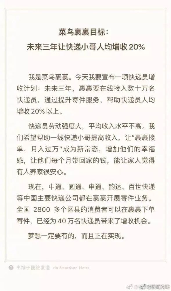 4月9日上午,菜鸟裹裹宣布一项快递员增收计划:未来三年,要在线接入数十万名快递员,通过提升寄件服务,帮助快递员人均增收20%以上。