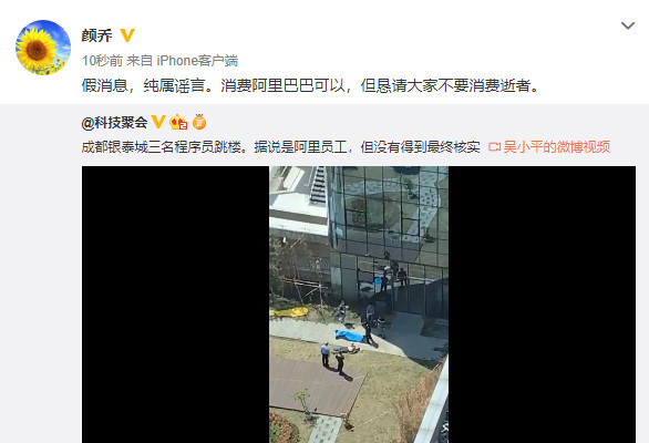 三言财经4月9日消息,今日,网传三名阿里程序员在成都银泰城跳楼轻生。对此,阿里巴巴集团CEO助理颜乔发微博回应称三名死者并非阿里巴巴员工,此事纯属谣言。颜乔称,“假消息,纯属谣言。消费阿里巴巴可以,但恳请大家不要消费逝...