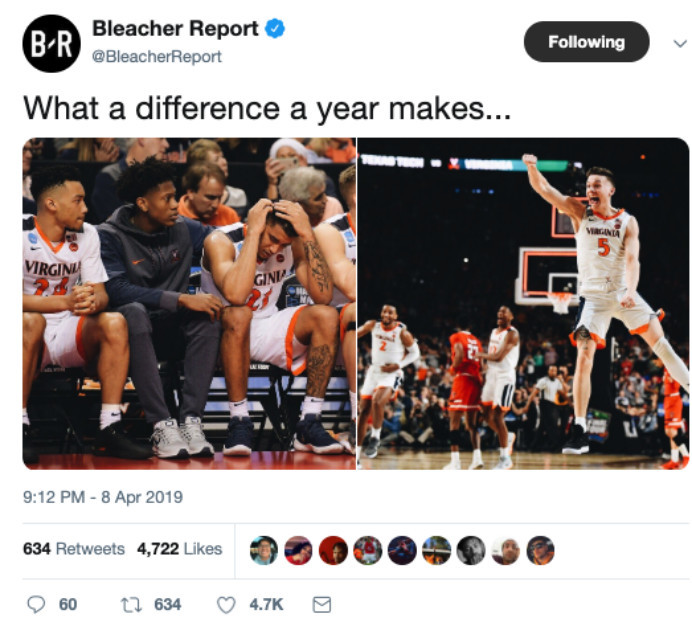 这一年来,弗尼吉亚过的并不容易。作为去年的头号种子,他们在首轮就出局,全队都承受着非常大的压力。不过,今天,他们终于一路过关斩将,拿下了球队队史的第一座NCAA总冠军,在社交媒体上,《露天体育看台》网站晒出了弗尼吉亚这两个赛季的对比照,然后写道,“这一年的改变。”