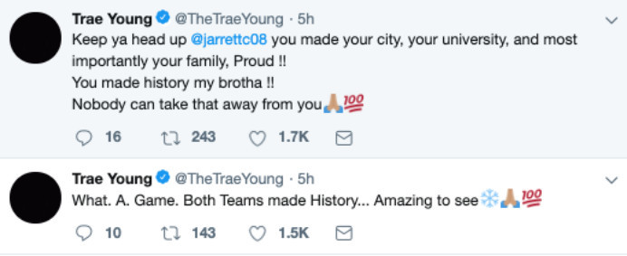 虽然最终输球,但得州理工大学的表现,还是得到了人们的认可,在社交媒体上,老鹰后卫特雷-杨就写道,““多么精彩的比赛,两支球队都创造了历史,贾勒特-卡尔弗请仰起头走出球馆,你已经让你的城市和大学引以为傲,家人也一定会以你为荣,我的好兄弟,你已经创造了历史,没人可以带走这些。”