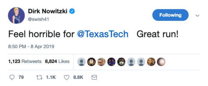 而独行侠前锋诺维茨基也在社交媒体上表示,“很棒的一场比赛,为得州理工感到难过,表现已经很不错了。”