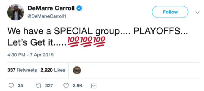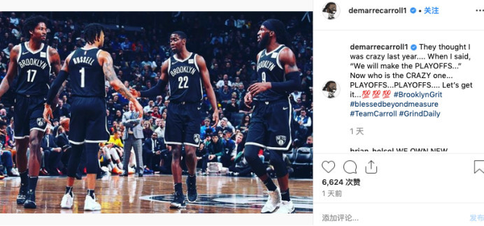 除此之外,卡罗尔还晒出了一张和队友们在球场的照片,然后写道,“去年的时候,他们觉得我是疯了。当时我说过,我们会进入到季后赛,现在,谁才是疯掉的那个?季后赛,季后赛。”