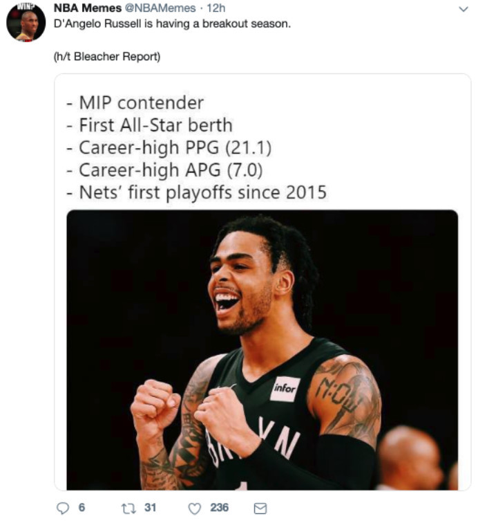 篮网能够杀入季后赛,离不开丹吉洛-拉塞尔的出色表现。这个赛季,拉塞尔首次入选了全明星,场均可以得到21.1分7次助攻,都是生涯新高,篮网重新回到了季后赛行列,而拉塞尔的老东家湖人,仍然深陷泥潭之中。