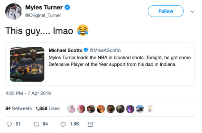 对阵篮网的比赛,迈尔斯-特纳表现一般,全场出战18分钟,得到了6分4篮板3盖帽。这场比赛,特纳的父亲身穿了一件印有儿子图像的T恤来到现场观战。T恤上面写着,特纳是最佳防守球员。而在社交媒体上,特纳转发了这张照片,然后写道,“这家伙,哈哈哈。”