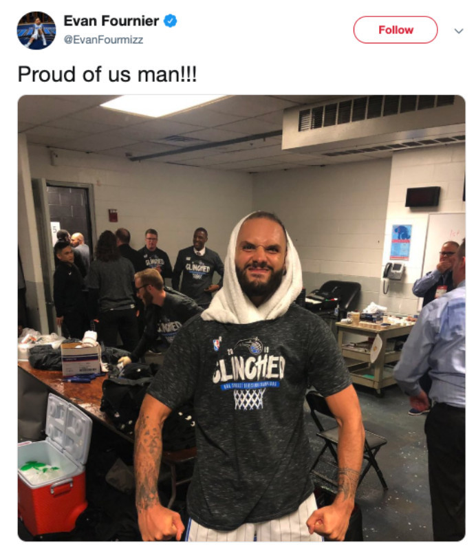 和篮网一样,上场战胜波士顿凯尔特人之后,魔术队也锁定了一个季后赛名额。这是魔术自从2011-12赛季之后,首次进入季后赛,全场比赛,福尼耶砍下了24分5篮板,在社交媒体上,福尼耶晒出了一张自己在更衣室的照片,然后写道,“为我们而感到骄傲。”值得一提的是,因为魔术进入到了季后赛,福尼耶也将获得15万美元的激励奖金。