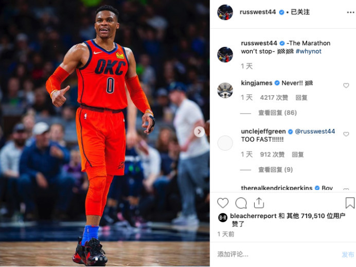 雷霆虽然早就锁定了季后赛的名额,但他们季后赛首轮的对手,可能要到常规赛的最后一天才能确定。在社交媒体上,韦斯布鲁克晒出了一张自己在比赛中的照片,然后写道,“马拉松不会停止。”