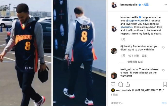 上场勇士对阵快船的比赛中,斯蒂芬-库里身穿前老大蒙塔-埃利斯球衣进入球场,这一画面也引起了媒体、球迷的关注。而今天在社交媒体上,蒙塔-埃利斯晒出了一张库里进入球馆时候的照片,然后写道,“感谢库里的爱,我很尊重、热爱你为勇士队做的一切。”
