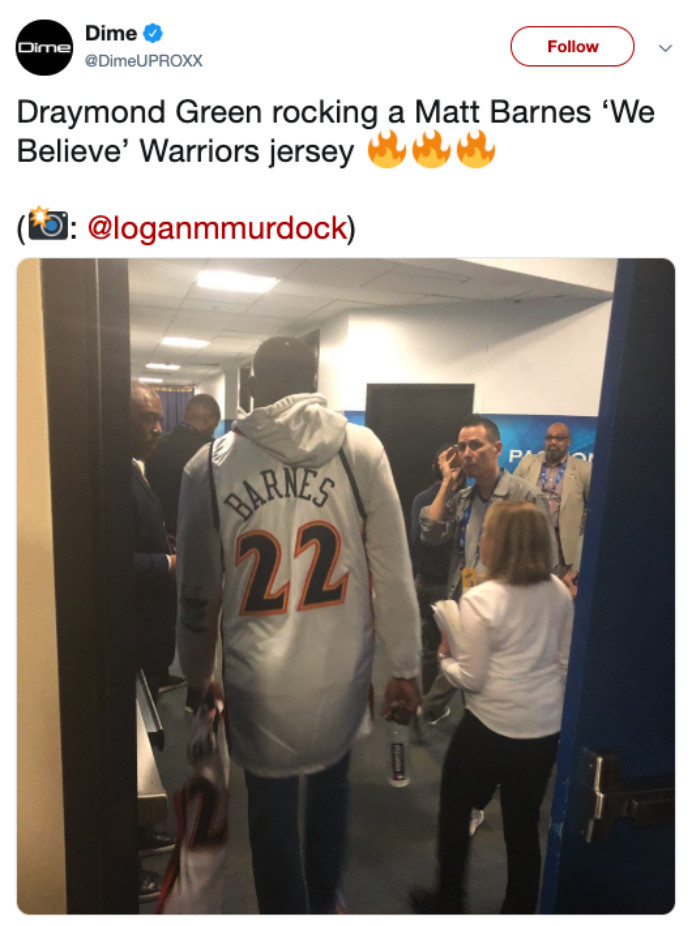 库里致敬的是埃利斯,而昨天的比赛结束之后,德雷蒙德-格林接受采访的时候,身穿的是一件马特-巴恩斯当年的战袍。