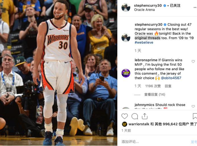 事实上,勇士已经结束了他们在甲骨文球馆的最后一场常规赛,下个赛季,他们将会搬迁到旧金山的新球馆。在社交媒体上,库里晒出了一张身穿勇士复古球衣的画面,然后写道,“用一种最好的方式,结束在这里的第47个赛季,甲骨文球馆今晚非常的火爆,回到最原来的模式,从09年到19年。”