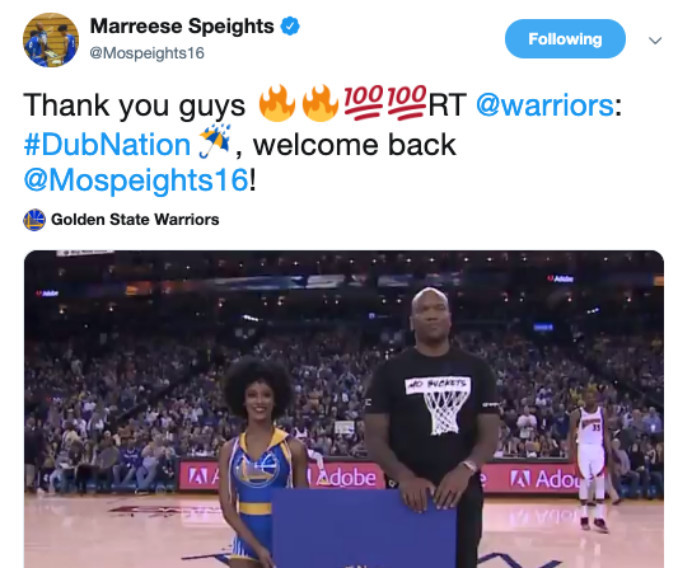 那场比赛中,勇士旧将斯贝茨也来到甲骨文中心,在社交媒体上,斯贝茨晒出了自己在球场的画面,然后写道,“感谢你们。”