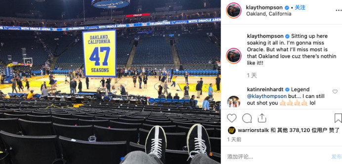 除此之外,克莱还晒出了一张自己独自坐在场边的照片,然后写道,“坐在这里沉思,我会想念甲骨文中心。但是最想念的还是奥克兰的爱,没有什么能够比得上。”