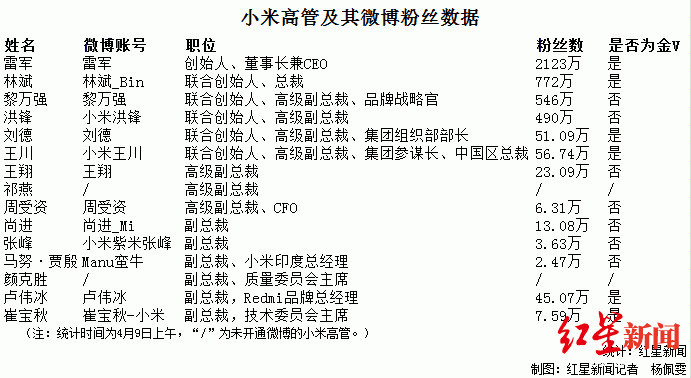 4月9日,据红星新闻记者统计,在小米官网公布的15名高管名单中,有13名高管开通了微博,共拥有粉丝4140.07万。其中,拥有金V(即月阅读量超过1000万)的高管有6名。