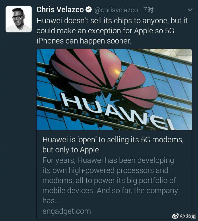 根据外媒 Engadget 报道称,华为将开放对外销售其 5G 芯片,但只会卖给苹果。早前就有消息指出,苹果在寻求可用的 5G 芯片上遇到困难。而新浪数码向苹果和华为公司询问时,两家公司都拒绝对此置评。此前,华为曾表示巴龙系列芯片主要为华为产品而服务,如手机和物联网产品,暂无对外出售的打算。华为公关方面对此表示不予置评。