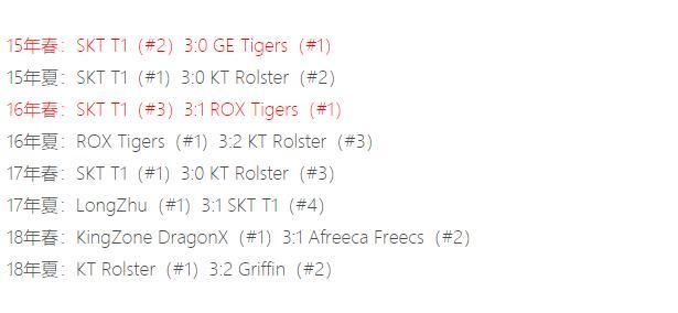 纵观LCK众多年来的总决赛,有了这个赛制以来,很少有战队能够从下面打上来并且干掉守擂者取得冠军,可见能拿到常规赛排名第一的战队的实力还是相当强的,至少对同赛区很多战队都是碾压的。不过也有两次下面的队伍完成了以下克上,而且两次都是SKT战队在春季赛的时候完成的,其中有15年打败GE Tigers和16年击败ROX战队,这下看来LCK如果说谁最有希望战胜GRF也就只有如今的SKT了。