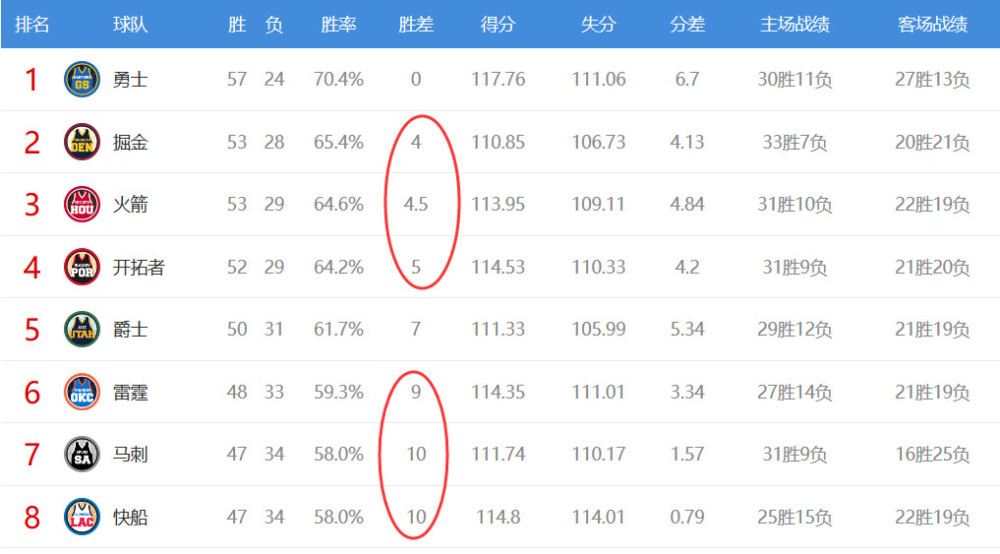 目前,西部头名已经没有悬念,勇士112-103击败鹈鹕之后,领先第二的掘金4个胜场,已经锁定西部第一。