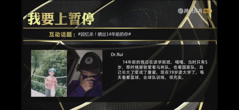 ID为“Dr.rui”的网友则写道:“十四年前的我还在读学前班,嘻嘻。第一张照片是五岁,那时候爸爸爱看马刺队,也看国家队,自己长大了变成了詹蜜。第二张照片十九岁,读了大学,看看篮球,去球队训练,很充实,偶尔去看看段老师的短视频。”