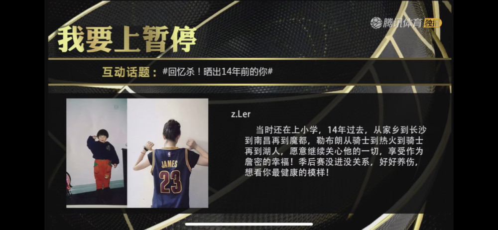 互动话题为#回忆杀!晒出14年前的你#的“我要上暂停环节”在今日湖人和开拓者的比赛直播中进行。腾讯NBA微信网友、腾讯体育社区网友纷纷晒照,讲述自己14年前和现在的样子。